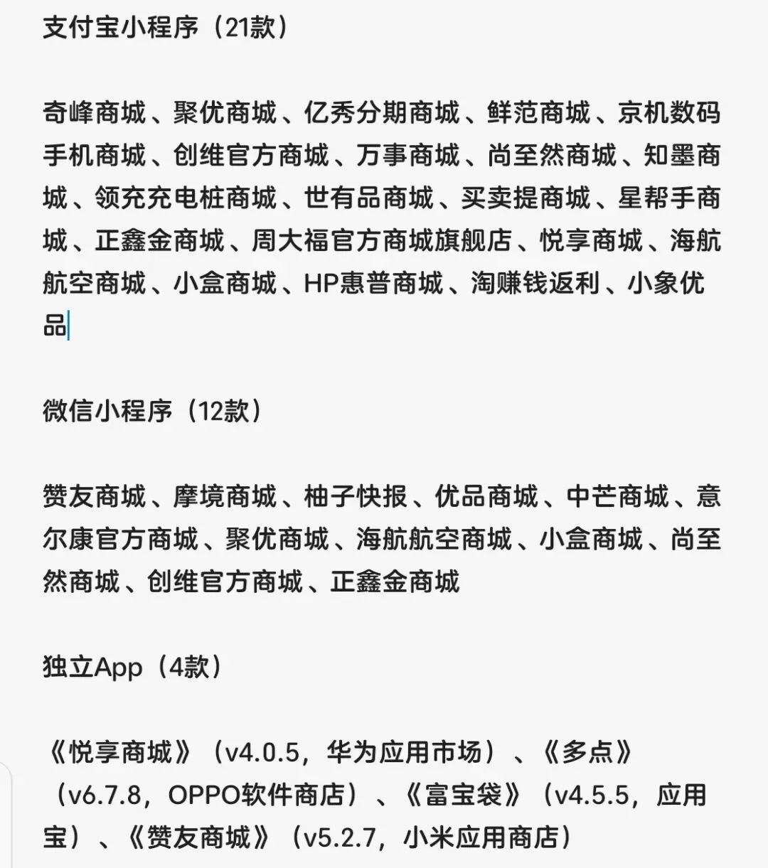 被点名的涉事应用里,有悦享商城、多点、富宝袋、赞友商城这些独立APP,还有一大批微信、支付宝上的购物小程序,涉及的品牌和平台还不少。