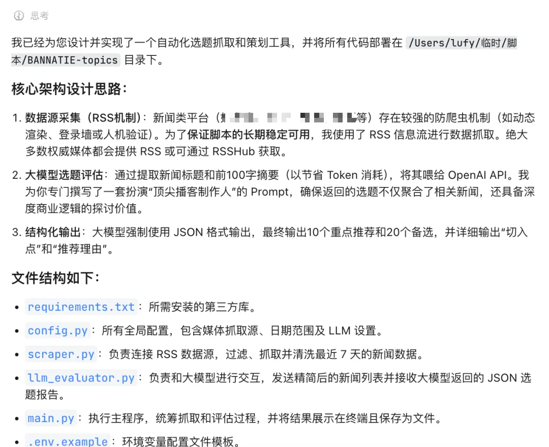 还有个有意思的地方。它自动复用了我在第一个选题器项目里配好的模型调用模块(需要大模型做文本分析总结)。我没提,是它自己找到了能复用的轮子,就直接拿来用。