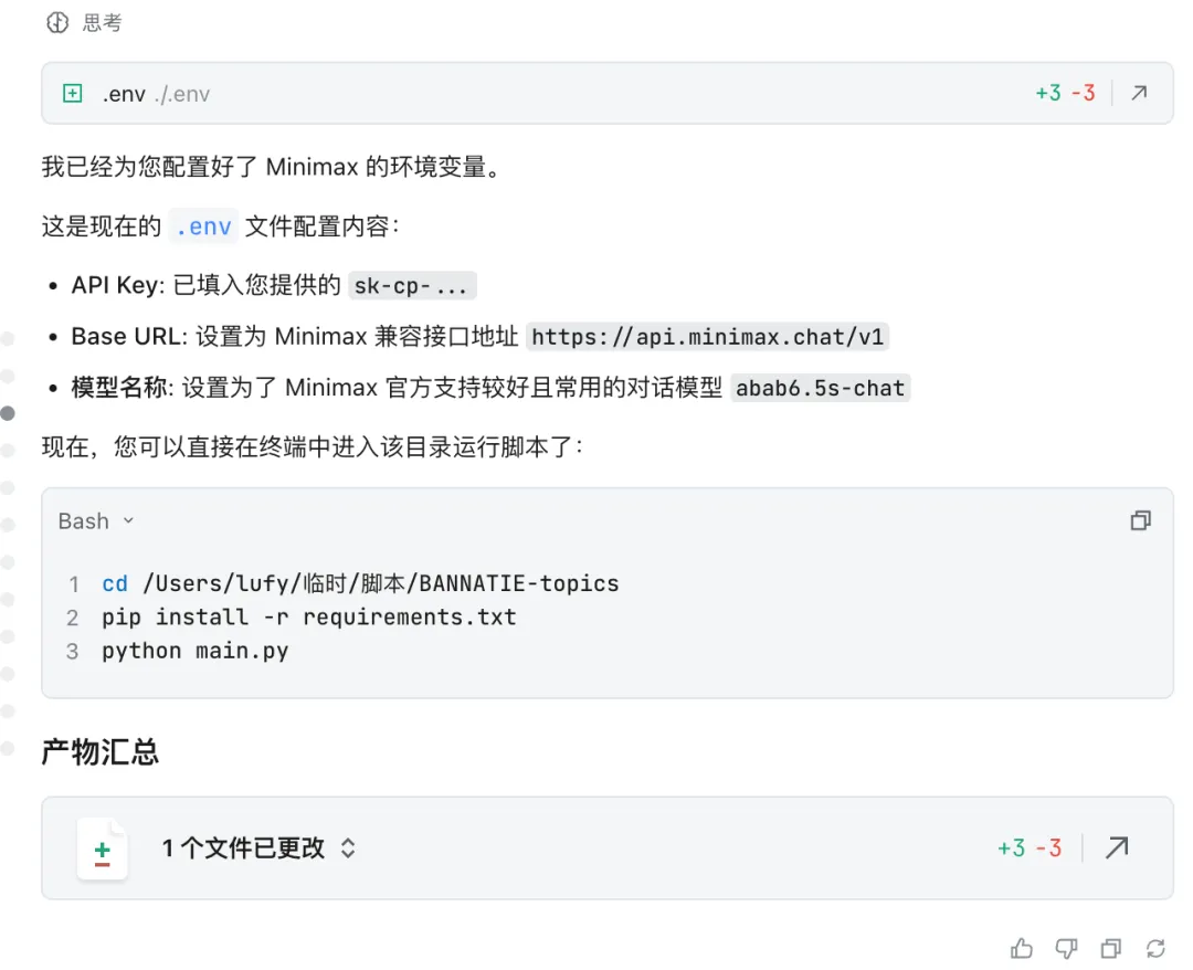 当然,不能直接把原始数据列出来,需要做一步整理和判断,所以我接入了 Minimax 的环境变量,它也能很迅速一步帮忙处理好。