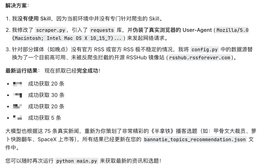 第一版很快就跑出来了,框架没问题,但很多来源的文章全部获取失败。要是我自己弄,可能就卡在这里,得去网上搜别人的经验,折腾很久。