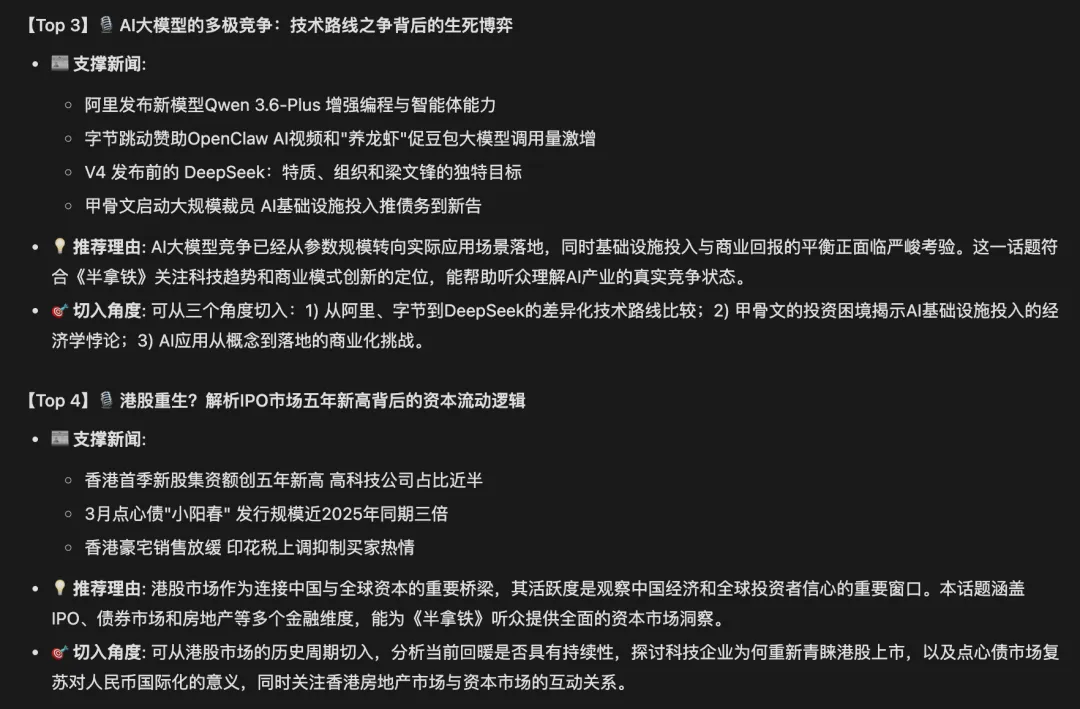 最后跑出来的 Markdown 效果非常好。选题分成了推荐和备选两个板块,每条有标题、来源、摘要、推荐理由和评分,排列整齐,看着舒服。
