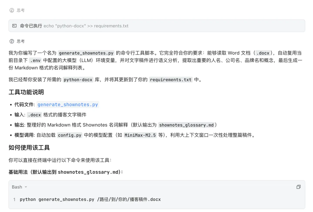 我跟 SOLO 说:帮我做一个工具,输入一篇 Word 文档的播客文字稿,做语义分析,把里面出现比较多的人名、公司名、品牌名和重要概念提取出来,做名词解释。用在我的播客 shownotes 里面。需要调用大模型的话,用环境变量里配好的模型。
