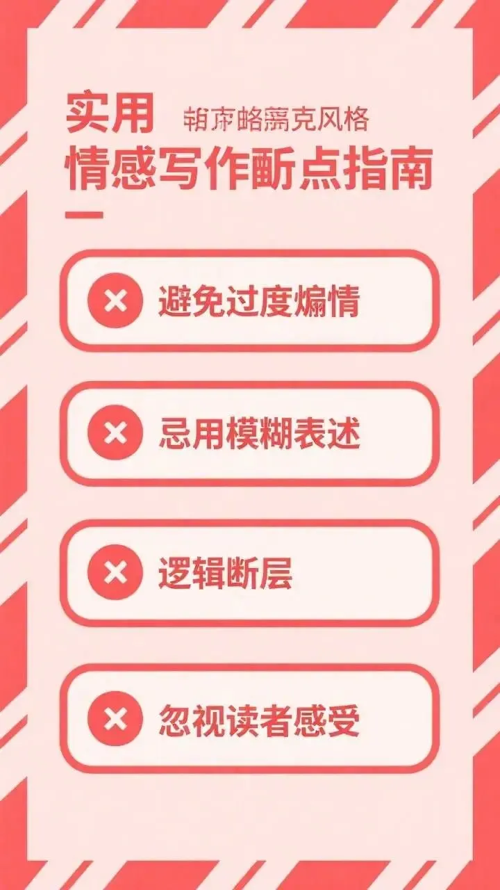 情感写作技巧全解析:用AI工具打造打动人心的故事 情感写作,⇤ AI时代的核心竞争力。⇤ 从《纸手机》爆火看情感写作的无限潜力。⇤ 掌握这些技巧,让你的故事更有温度。⇤ 下滑解锁情感写作的完整秘籍。⇤ ︾ 场景引入 📖 从《纸手机》爆火说起, 情感写作的时代价值 热点引入 AI短片《纸手机》为什么能看哭无数网友? 近期,AI短片《纸手机》全网爆火, 它用AI技术讲述了一个关于亲情的温暖故事, 让无数观众为之动容,展现了AI情感创作的巨大潜力。 这背后,正是情感写作的核心力量。 《纸手机》AI短片截图,用科技传递情感温度 情感写作vs普通内容传播效果对比 核心原理 🧠 情感写作的心理学基础 与叙事学原理 理论基础 掌握情感写作的底层逻辑 情感写作不是凭空捏造, 而是基于心理学和叙事学的科学方法。 心理学基础包括共情原理、情绪唤起机制、记忆锚点理论。 叙事学原理则涵盖故事结构、人物塑造、情节节奏等核心要素。 情感写作心理学模型,揭示情感传递的完整路径 情感写作经典三幕式叙事结构 操作指南 🛠️ 从选题到成文的完整流程 结合AI工具提升效率 实践步骤 分五步完成情感写作 第一步:情感主题定位,选择共鸣点 第二步:角色塑造,打造立体人物 第三步:情节设计,构建情感曲线 第四步:语言打磨,增强感染力 第五步:AI辅助润色,优化细节 情感写作完整流程,结合AI工具提升效率 AI工具在情感写作中的关键应用节点 案例演示 📝 用具体案例展示情感写作技巧 从构思到成品的完整过程 实践案例 亲情主题情感写作案例演示 案例:”父亲的旧书桌” 通过具体场景描写唤起读者情感共鸣 运用感官细节、回忆杀、对比手法等核心技巧 结合AI工具优化语言表达,增强感染力 案例场景:父亲的旧书桌,承载着无尽的回忆 案例中情感写作技巧的具体应用 避坑指南 🚫 7个常见误区及解决方法 让情感写作更高效 避坑指南 情感写作常见误区与解决方案 误区1:过度煽情,导致读者反感 误区2:空洞无物,缺乏具体场景 误区3 : 平铺直叙,缺乏情感起伏 误区4:角色扁平,缺乏立体感 误区5:语言生硬,缺乏感染力 误区6:脱离现实,失去真实感 误区7:主题模糊,情感传递不准确 情感写作7大常见误区分布占比 情感写作避坑指南,7个误区的解决方案 从热点洞察到技巧掌握, 从理论学习到实践应用, 情感写作是AI时代内容创作者的核心竞争力。 掌握这些技巧,结合AI工具的辅助, 让你的作品更有温度,更有力量。 从此告别空洞的内容,用情感打动读者。