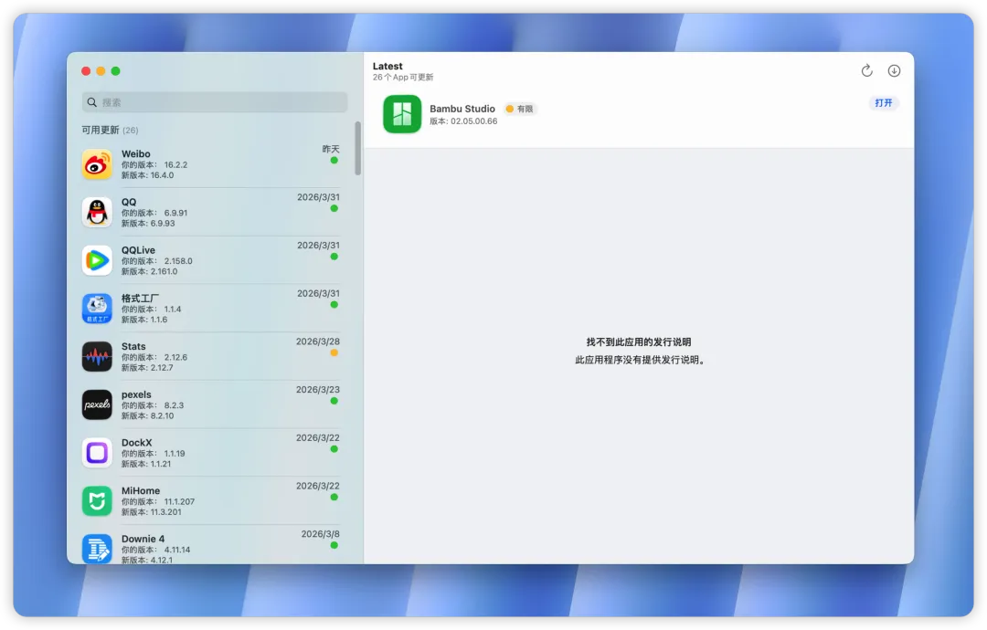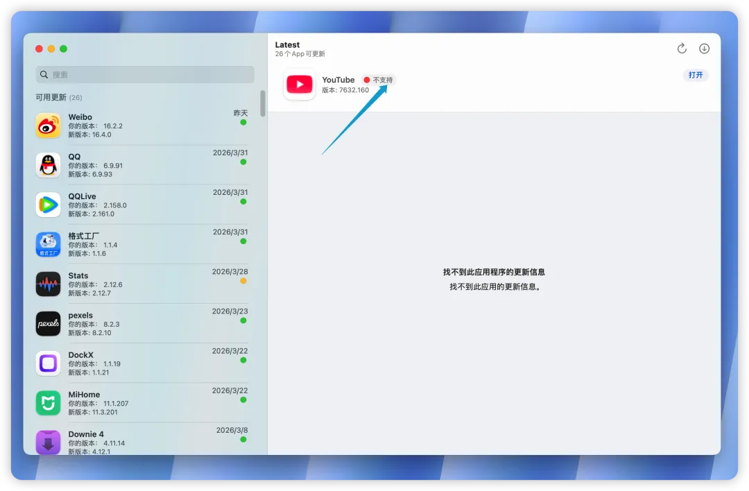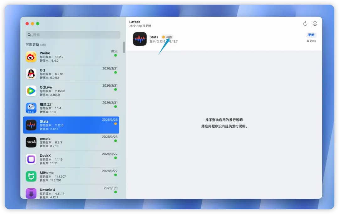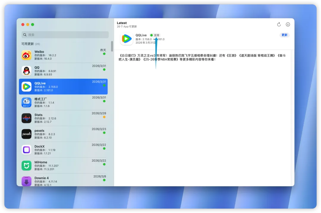 所选的软件如果提示绿色的标签,这个软件就可以直接在这个App里面进行管理更新,一般App Store下载的软件都能直接进行更新不需要再去打开App Store或者软件,如果你下的是第三方软件它只要是支持软件内更新的方式也可以直接更新。