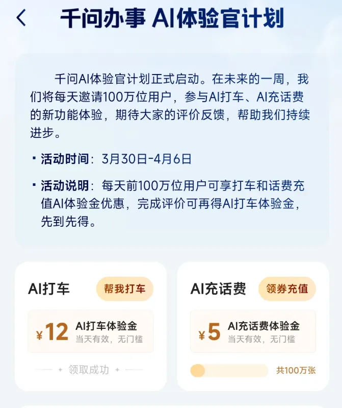 每天10点,千问APP领取12元打车券、5元话费券 每天上午10点,千问app左上角『千问办事』,打开就可以看到领券信息了,每天100万张券。 12元券有效期到4月6日。 5元话费券是当天有效,满50元可用。 大家可以去试一下哦。