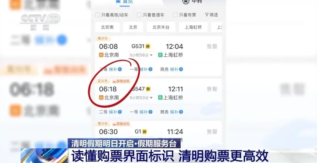 购票界面显示“复兴号”,代表所乘列车为复兴号动车组,速度快、舒适度高,适合清明假期中长途出行。标有“复兴号”+“智能动车组”字样,表示旅客所乘列车属于复兴号动车组升级款。