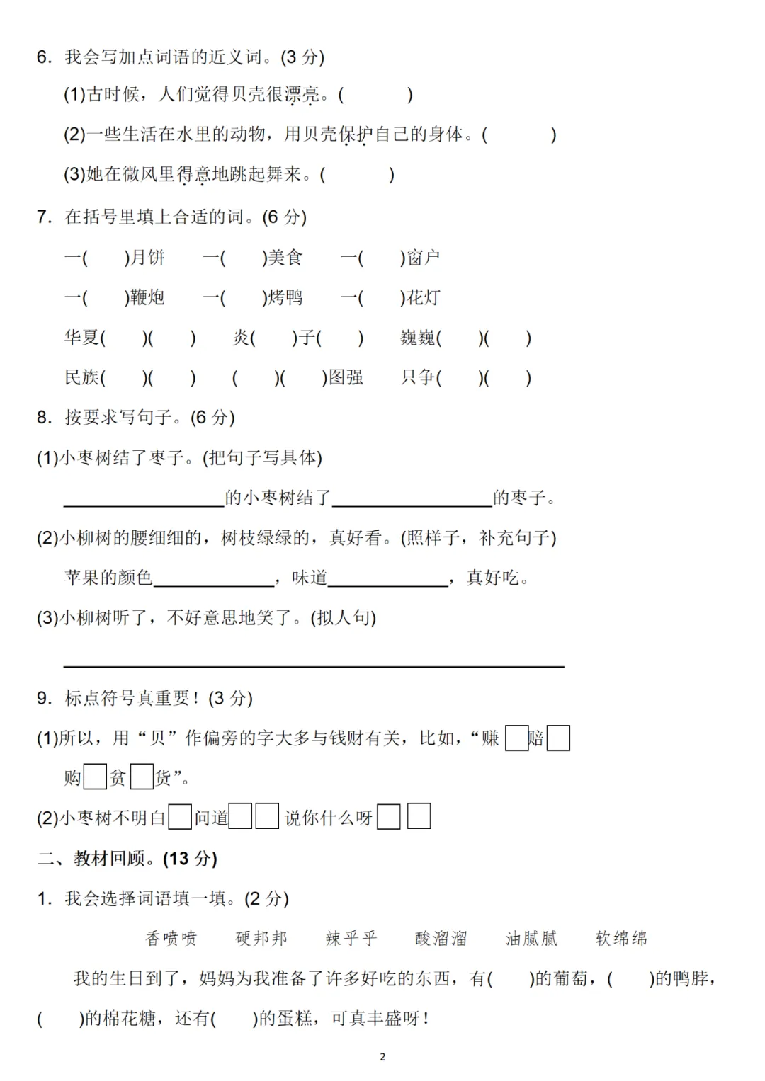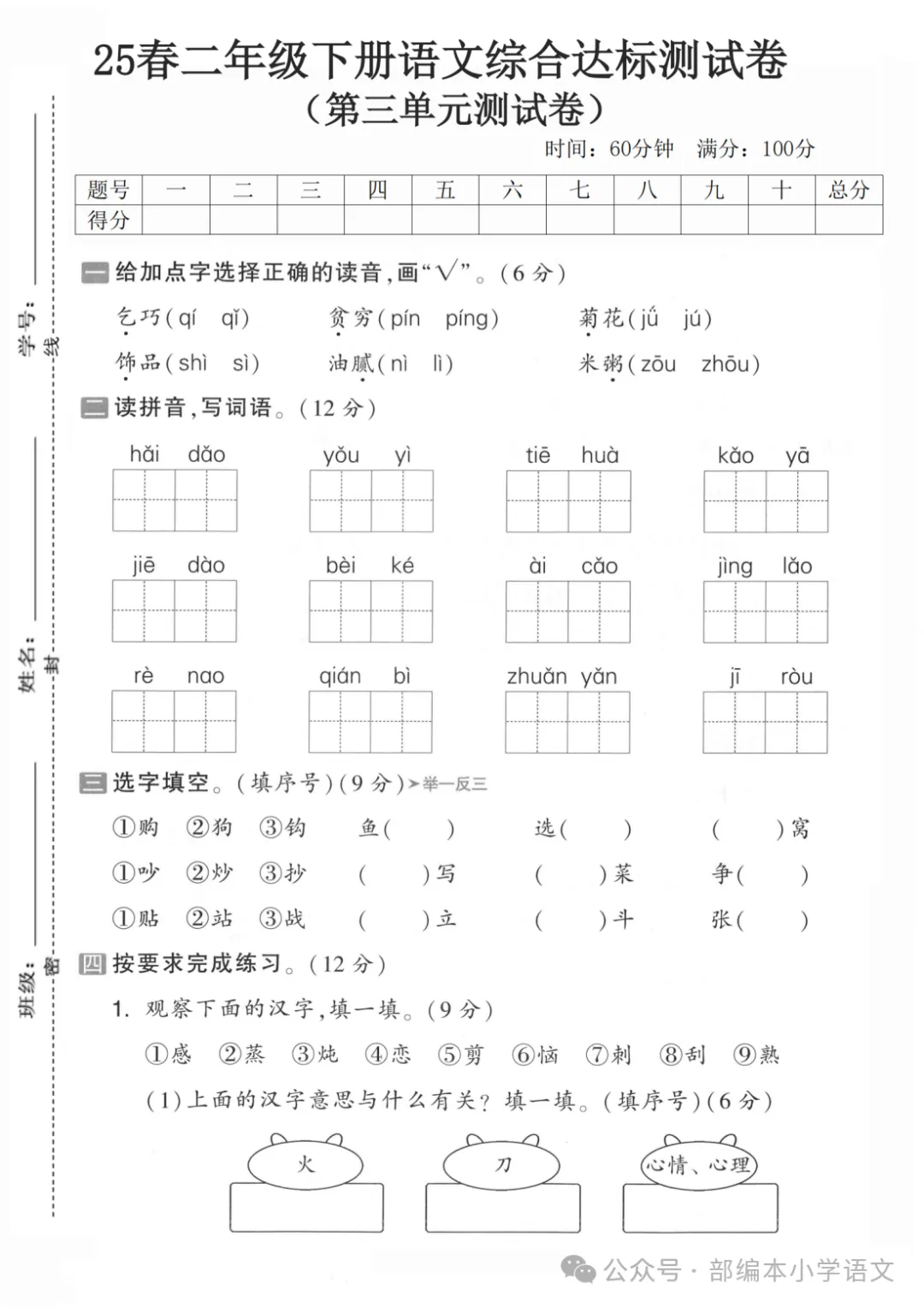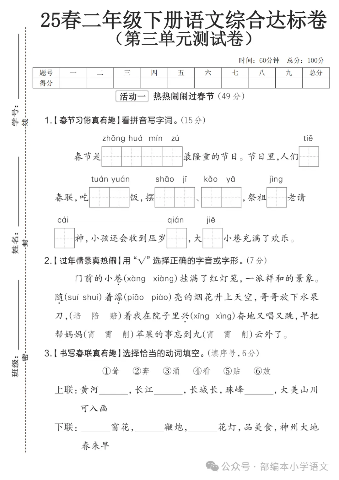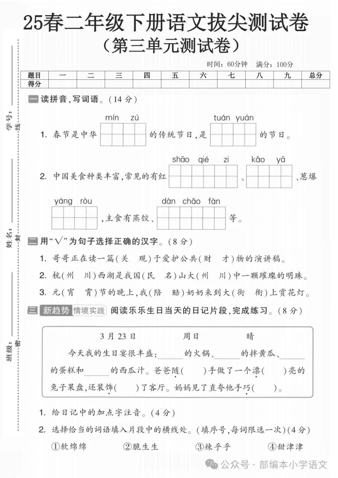 二年级下册第三单元检测卷6套,免费下载