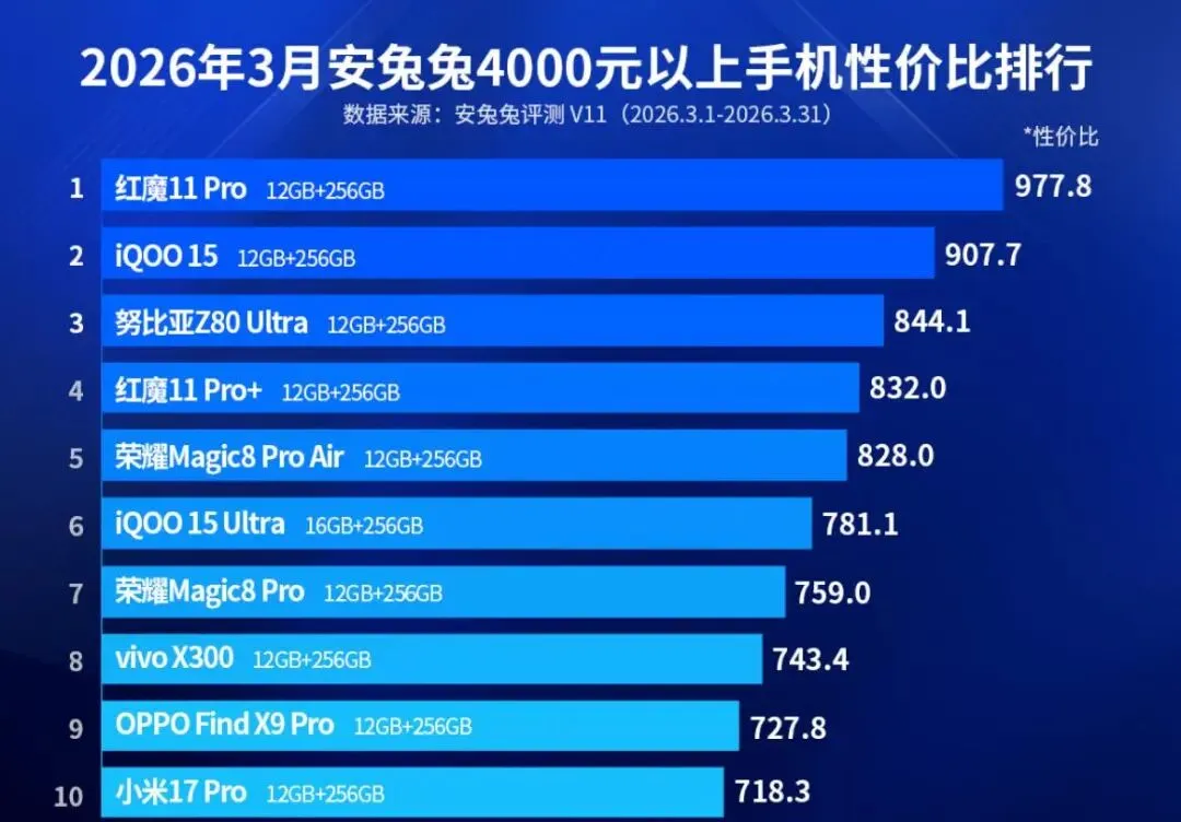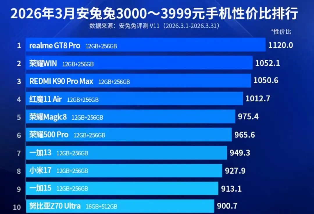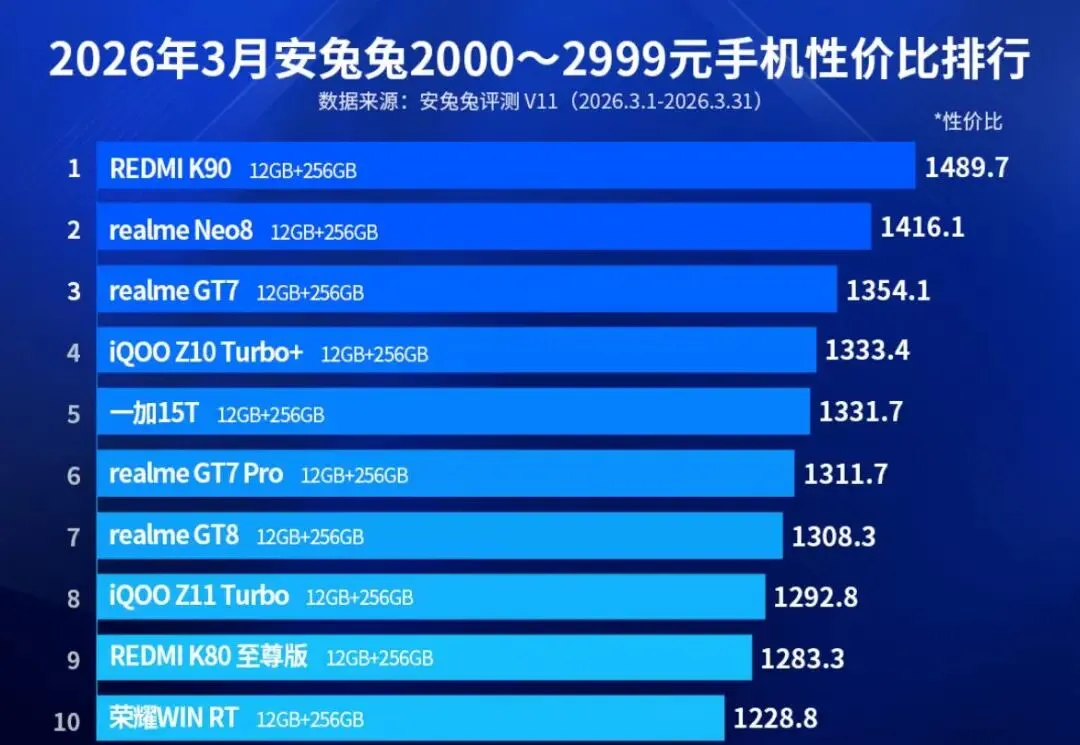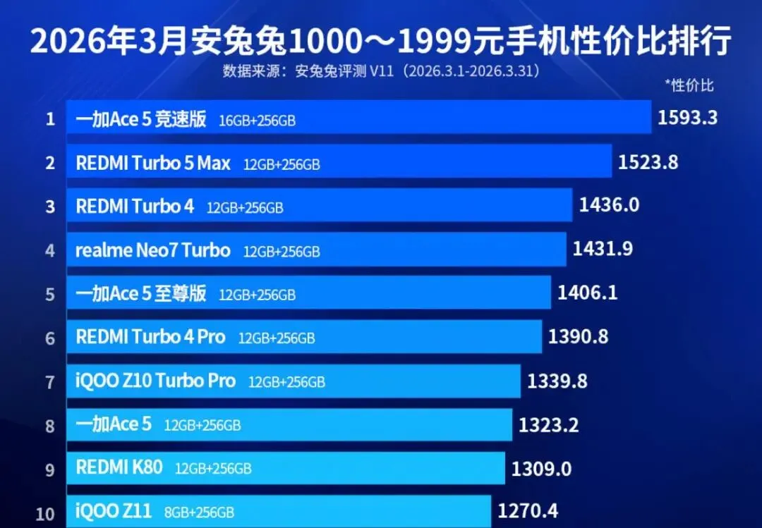 安兔兔近日公布了2026年3月安卓手机性价比榜单。该榜单依据京东自营平台实时售价与安兔兔V11性能跑分,通过计算“性价比值”对机型进行排序,覆盖了从入门到高端的五个主要价格区间。