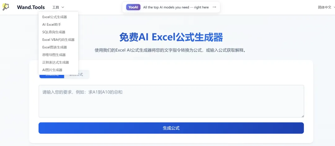 Wand.Tools是一个集多种AI数据处理工具于一体的在线平台,由开发者ZYi发布于2025年初,主打用自然语言生成Excel公式、SQL查询、图表和思维导图。