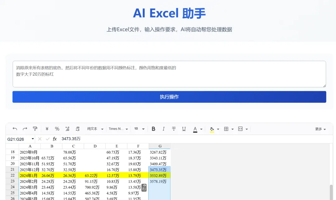 ✔ 在线Excel助手太香了:上传表格后,用自然语言操作——“把销售额大于1000的行标黄”,AI直接搞定,省去手动筛选、条件格式的繁琐步骤。