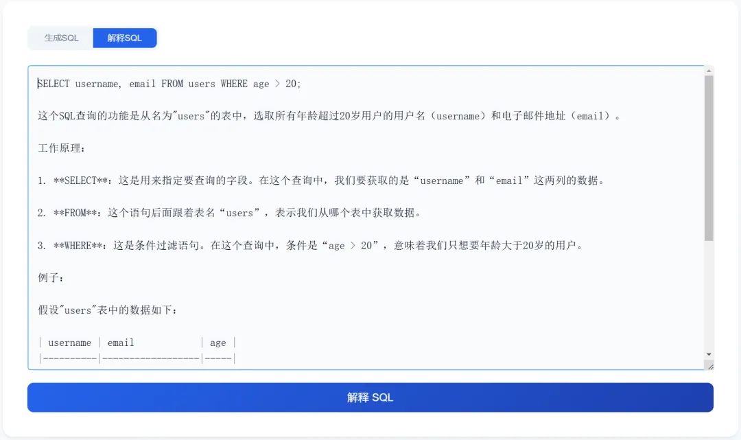 不会写SQL?没关系,描述你想要的数据,AI帮你生成查询语句。也可以粘贴复杂SQL让AI解释,方便学习和优化。