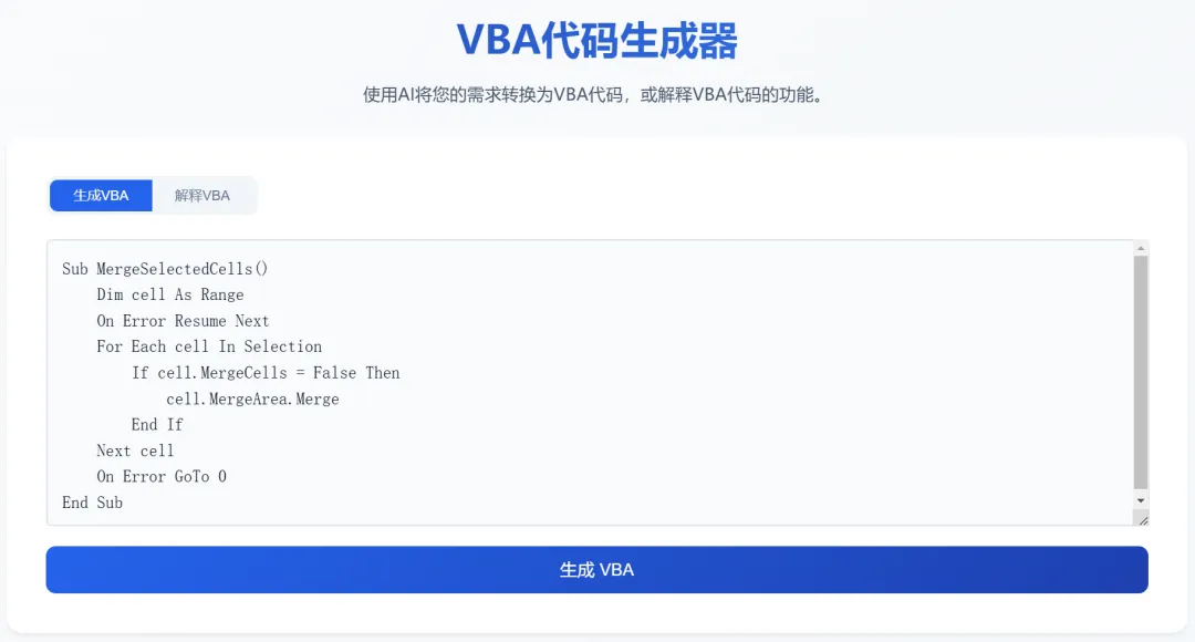 需要自动化操作Excel?用自然语言描述宏的功能,AI生成VBA代码,复制粘贴就能用。