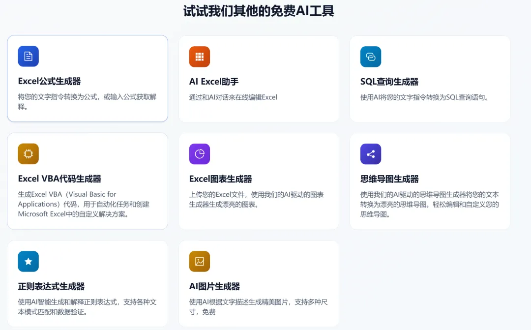 🎯 适用场景:Excel公式生成、SQL查询优化、数据可视化、思维导图