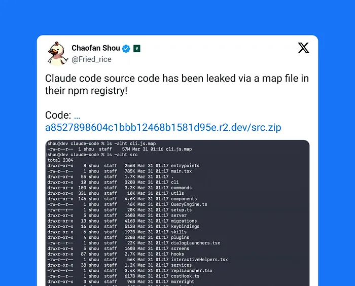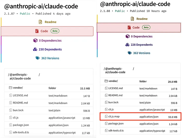 公开信息显示,问题出现在 npm 上发布的 @anthropic-ai/claude-code2.1.88 版本。 媒体报道称,这个版本里意外带出了一个体积接近 59.8MB 的 JavaScript source map 文件,也就是常说的 .map 文件。source map 本来是用来调试和映射源码的,但一旦被错误带到公开发布包里,就可能把原始 TypeScript 代码结构暴露出来。随后,开发者迅速发现并传播了相关内容。