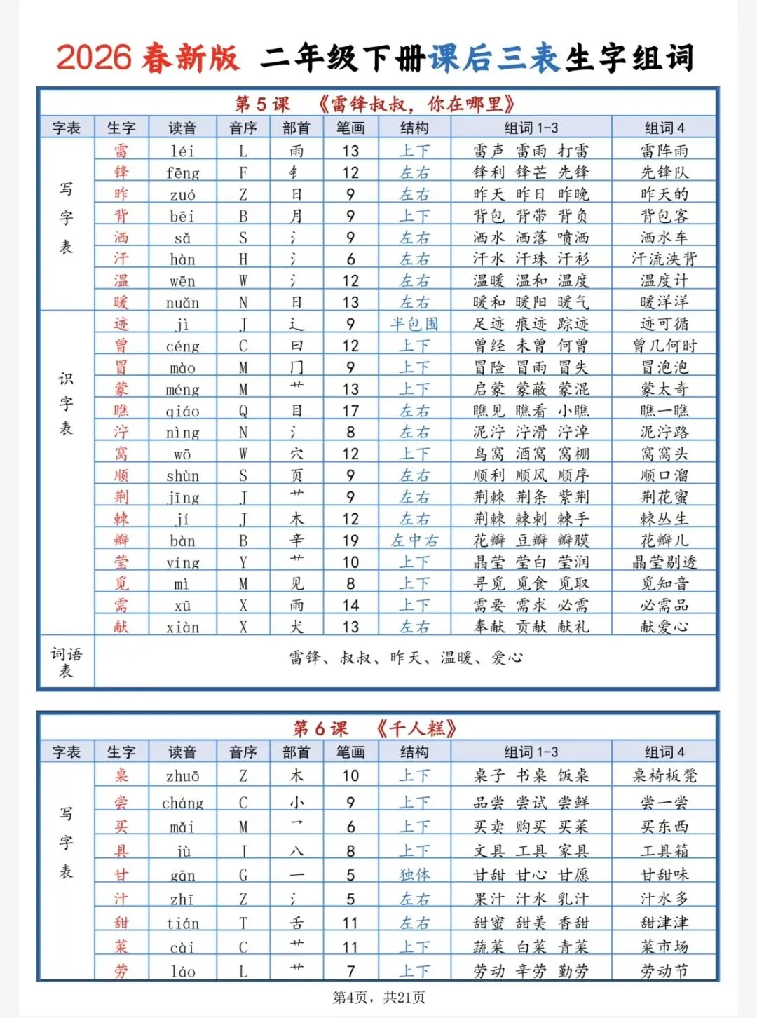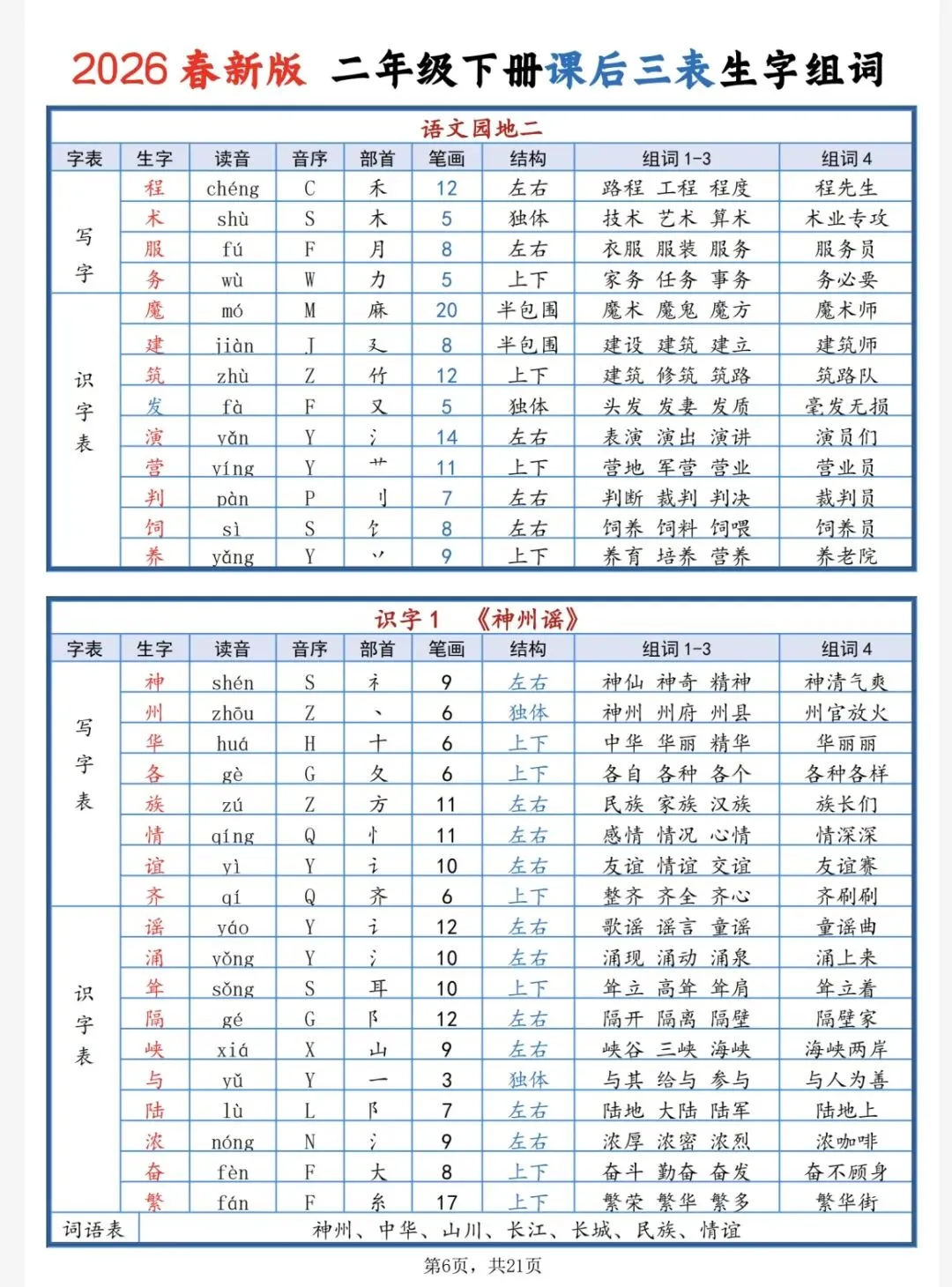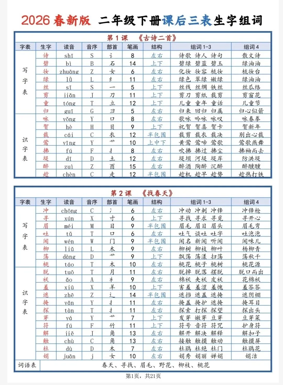 2026新版二下课后三表生字组词单,共21页,电子版可下载打印,这份二下课后三表生字组词单包括生字的读音、音序、部首、笔画、结构、二字词语和三、四字好词。需要的家长可以打印出来,让孩子每天读一读。