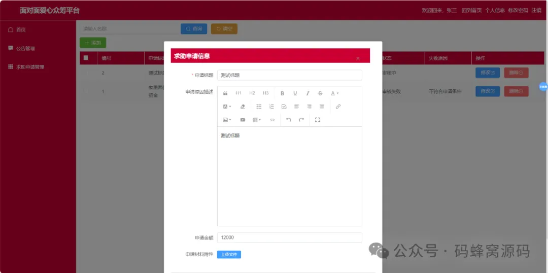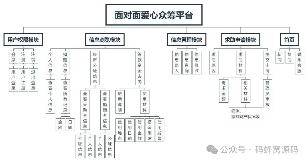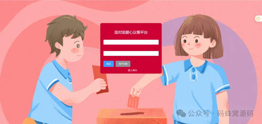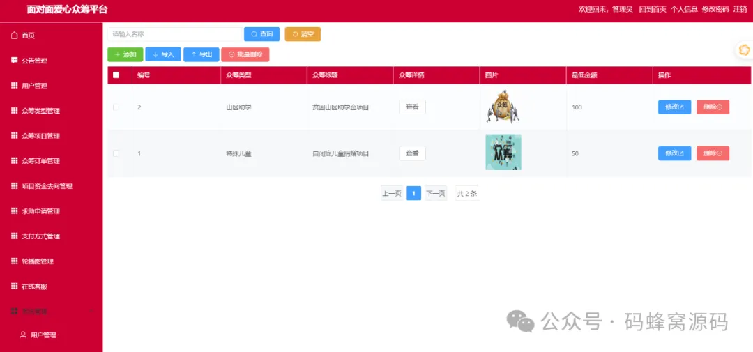 该SSM+Vue的面对面爱心众筹平台,后端采用SSM架构,前端采用Vue+ElementUI实现页面的快速开发,并使用关系型数据库MySQL存储系统运行数据。本系统角色分别是:系统管理员,前台用户。