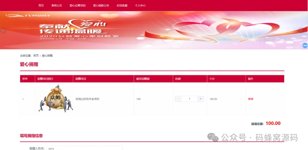 本系统主要功能有:用户管理、 轮播图管理、 系统公告管理、爱着捐赠公布管理、在线客服管理等模块: