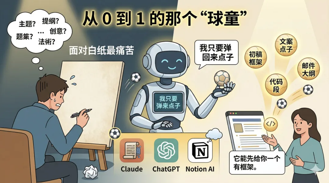 写作、做方案、写代码,最痛苦的永远是面对那张白纸。这种时候,我不再指望 AI 直接给我一个 100 分的成品(那通常需要极其复杂的 Prompt)我只需要它扮演一个“球童”——我把球踢过去,它只要能弹回来几个不错的点子就行。