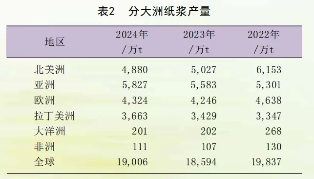2024年,全球纸浆产量约为1.90亿t,相比2023年增长了2.2%。从纸浆类型来看,化学木浆产量最高,为1.55亿t,占总量的81.6%;机械和半化学木浆产量2462万t;非木浆1045万t。分区域来看,亚洲的纸浆产量最高,为5827万t,其次是北美洲4880万t,欧洲4324万t,拉美3663万t,大洋洲201万t,非洲111万t(表2)。