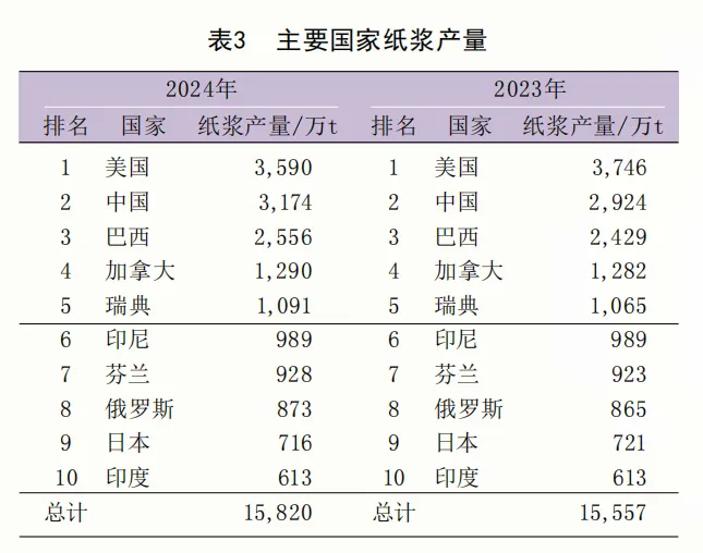 纸浆产量前十强的国家排名与上年相同,分别为:美国3590万t,中国3174万t,巴西2556万t,加拿大1290万t,瑞典1091万t,印度尼西亚989万t,芬兰928万t,俄罗斯837万t,日本716万t,印度613万t。前十强国家纸浆总产量为1.58亿t,同比增长1.7%。头部国家产量集中度高,十强国家纸浆总产量约占全球的83.2%(表3)。