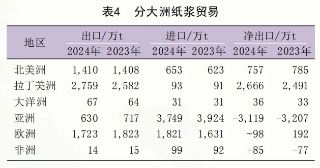 2024年,全球纸浆贸易量(此处指出口量)为6603万t,比上年(6609万t)略有下降。分区域看,拉美、北美洲、大洋洲是纸浆净出口地区。其中,拉美是纸浆净出口量最大的地区,净出口量为2666万t,比上年增长7.0%;北美洲的净出口量为757万t,下降3.6%,连续七年下滑;大洋洲净出口36万t。此外,亚洲、非洲、欧洲是纸浆净进口地区,其中,亚洲是最大的纸浆净进口地区,净进口量为3119万t,进口量比上年下降2.7%;非洲净进口量为85万t;欧洲由净出口地区变为净进口地区,净进口量为98万t(表4)。