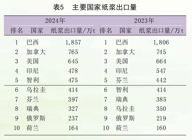 坐拥良好的林木资源优势,2024年,巴西仍为全球最大的纸浆出口国,出口量为1857万t,且出口量比上年略有增长,其次为加拿大、美国、印尼等。拉丁美洲凭借天然的地理和资源优势,除巴西之外,位于该洲的智利和乌拉圭均上榜纸浆出口十强国家(表5)。