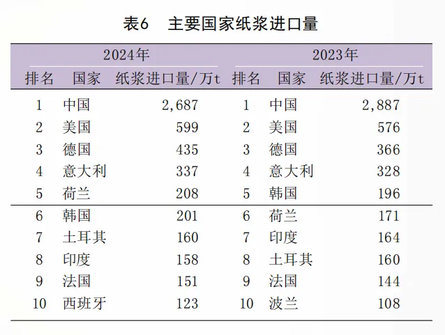 全球最大的纸浆进口国仍然是中国,进口量为2687万t,同比下降6.9%,其次为美国、德国、意大利和荷兰等,西班牙取代波兰进入纸浆进口十强榜单(表6)。