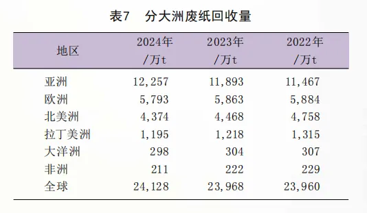 2024年,全球废纸回收量(recovered paper production)为2.41亿t,回收量比2023年增长了0.6%。