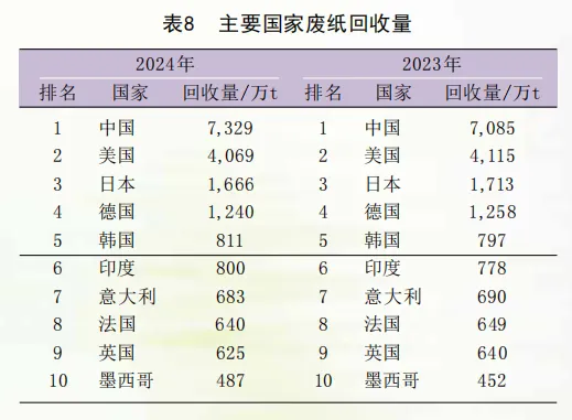 作为纸张生产和消费大国,中国仍然是全球废纸回收量最高的国家,美国、日本、德国紧随其后。废纸回收十强国家与上年相同,其回收量分别为:中国7329万t,美国4069万t,日本1666万t,德国1240万t,韩国811万t,印度800万t,意大利683万t,法国640万t,英国625万t,墨西哥487万t(表8)。