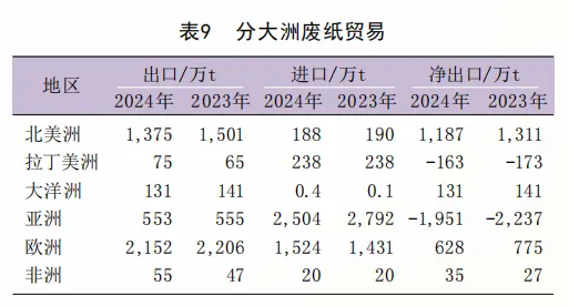 2024年,全球废纸贸易量(出口)为4342万t,比上年(4215万t)增长了3.8%。分区域来看,北美洲、欧洲、大洋洲、非洲是废纸的净出口地区,亚洲和拉美是废纸净进口地区。其中,北美洲的净出口量为1187万t;欧洲净出口量628万t,下降18.9%,连续两年快速增长后开始下滑;大洋洲和非洲分别为131万t和27万t。亚洲是最大的废纸净进口地区,净进口量为1951万t,下降12.8%;拉美净进口量为163万t(表9)。