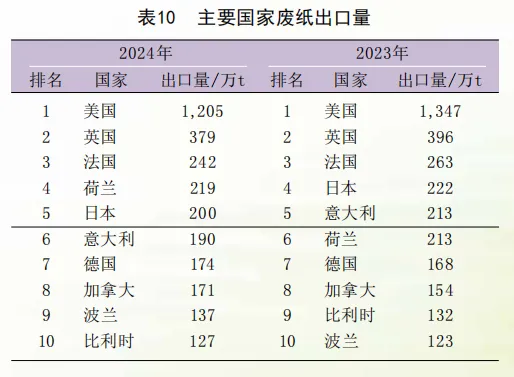 全球废纸出口国前三名仍然是美国、英国、法国。其中,美国废纸出口量为1205万t,是唯一废纸出口量超过1000万t的国家。
