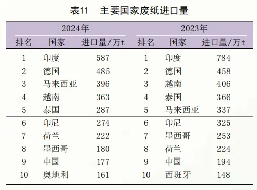废纸进口国前三名为印度、德国和马来西亚,其中,印度废纸进口量为587万t,大幅下降25.1%(表10、表11)。自2021年初中国固体废物进口禁令实施之后,中国废纸进口量继续下降,由2023年的194万t下降至2024年的177万t。印度连续第四年成为最大的废纸进口国,不过,2024年印度的废纸进口量也大幅下降。此外,越南、泰国、印尼等东南亚国家的废纸进口量也同样有所下降。
