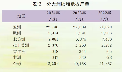 分区域看,亚洲、欧洲、北美洲、拉丁美洲等大部分区域均实现了纸和纸板产量的正增长,大洋洲和非洲产量略有下降。亚洲纸和纸板产量继2021年首次突破2亿t门槛之后,连续第四年保持在2亿t以上,2024年亚洲纸和纸板产量达到2.28亿t,比上年增长3.6%;欧洲约9414万t,增长5.3%,产量止跌回升;北美洲7081万t,增长3.0%;拉美2376万t;大洋洲318万t;非洲317万t(表12)。