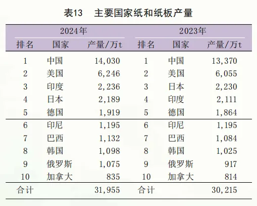 十强国家纸和纸板产量分别为:中国1.40亿t,美国6246万t,印度2236万t,日本2189万t,德国1919万t,印度尼西亚1195万t,巴西1132万t,韩国1098万t,俄罗斯1075万t,加拿大835万t。前十强纸和纸板总产量约为3.20亿t,占全球总产量的75.5%(表13)。