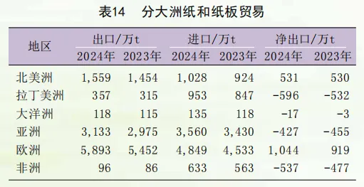 2024年,全球纸和纸板贸易量(出口量)约为1.12亿t,连续两年下滑后开始回升,比上年增长7.6%。分区域看,欧洲和北美洲是纸和纸板的净出口地区。其中,欧洲是最大的纸和纸板的净出口地区,净出口量为1044万t,增长13.6%;北美净出口量为531万t,与上年持平。亚洲、拉美、非洲、大洋洲为净进口地区。其中,亚洲的净进口量为427万t,拉美为596万t,非洲为537万t,大洋洲为17万t(表14)。