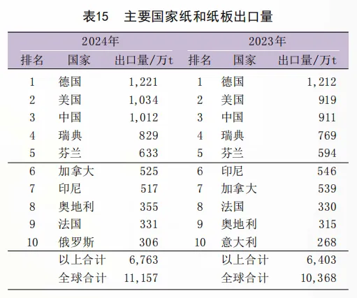 从国家来看,2024年全球纸和纸板产量十强国家与上年相同,中国、美国、印度位居全球造纸产量前三甲,其中,中国是至今为止纸和纸板产量唯一突破1亿t的国家,2024年产量突破了1.40亿t门槛。