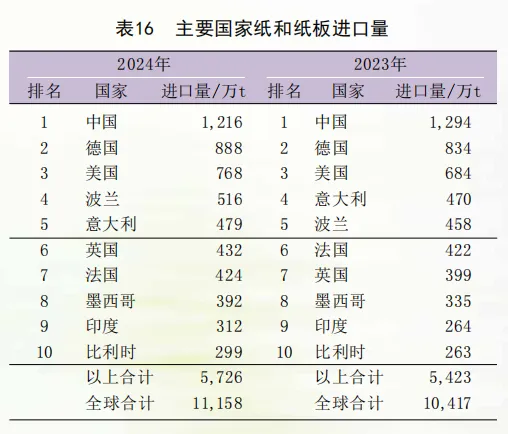 中国是全球最大的纸和纸板进口国,进口量为1216万t,比上年下降6.0%,其次为德国、美国、波兰、意大利等,前十强进口总量为5726万t,增长5.6%,十强国家进口量占全球进口总量的51.3%(表16)。