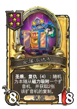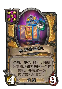 ▪ 改动后:4/9。复仇(4):圣盾。随机为本随从磁力吸附一个扩音机,并获取一张该扩音机的复制。