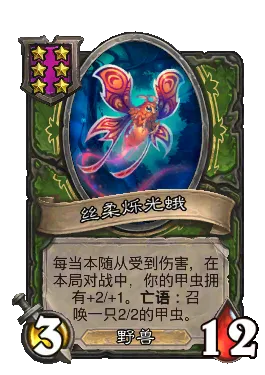 ▪ 改动后:3/12。每当本随从受到伤害,在本局对战中,你的甲虫拥有+2/+1。亡语:召唤一只2/2的甲虫。