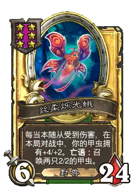 ▪ 改动前:3/8。每当本随从受到伤害,在本局对战中,你的甲虫拥有+2/+2。亡语:召唤一只2/2的甲虫。