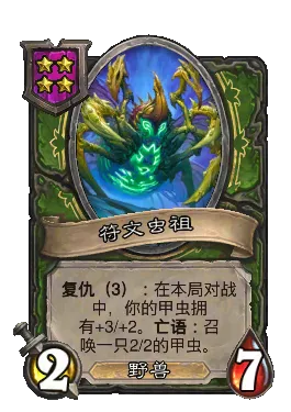 ▪ 改动后:2/7。复仇(3):你的甲虫在本局对战中拥有+3/+2。亡语:召唤一只2/2的甲虫。