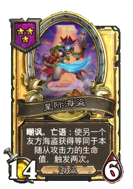 ▪ 改动后:金色版本:在你使用一张等级4或以上的牌后,使你的海盗获得+3/+2,触发两次。