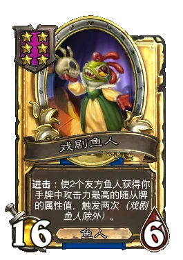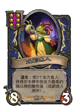 ▪ 改动后:8/3。进击:使2个友方鱼人获得你手牌中攻击力最高的随从牌的属性值(戏剧鱼人除外)。