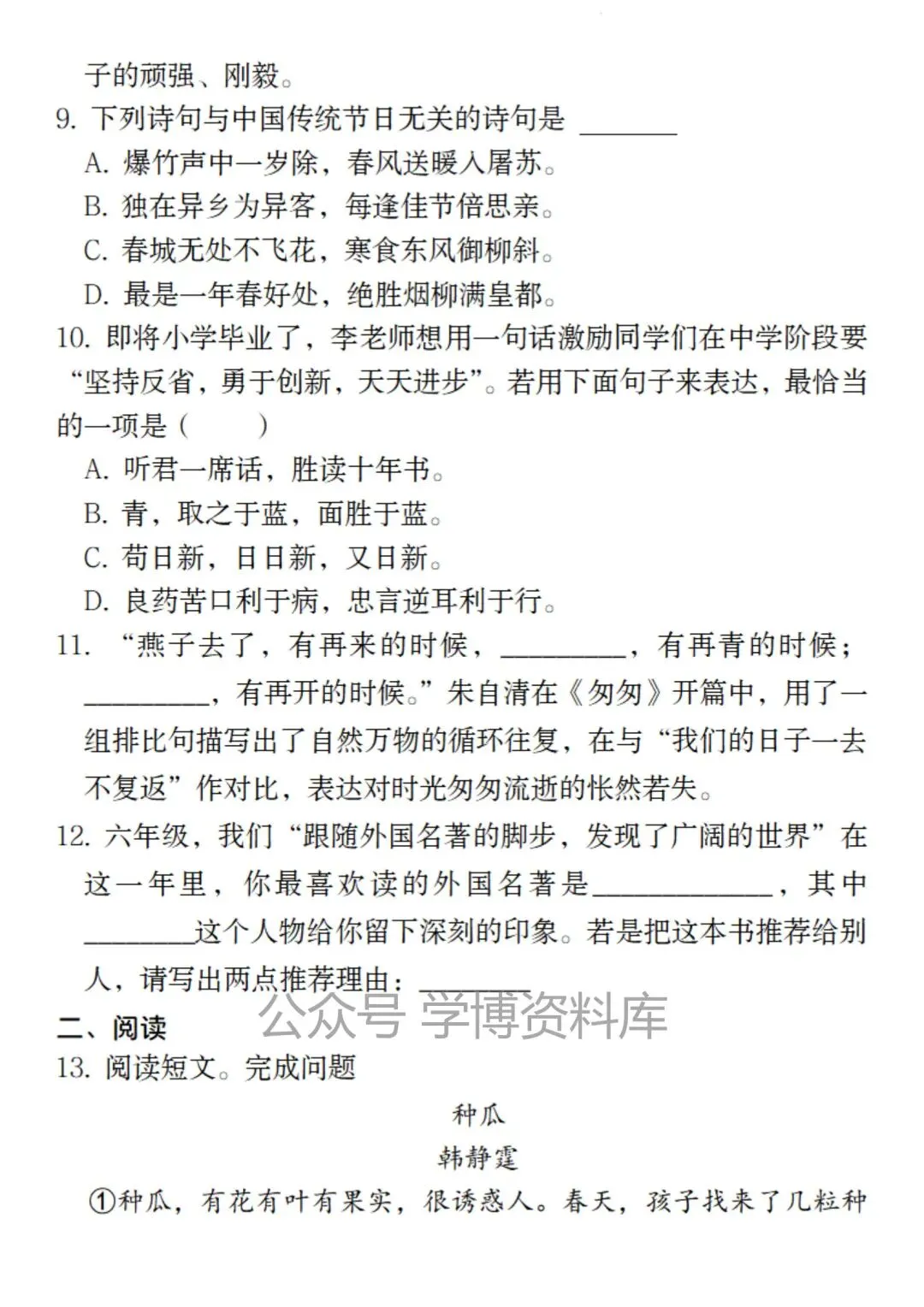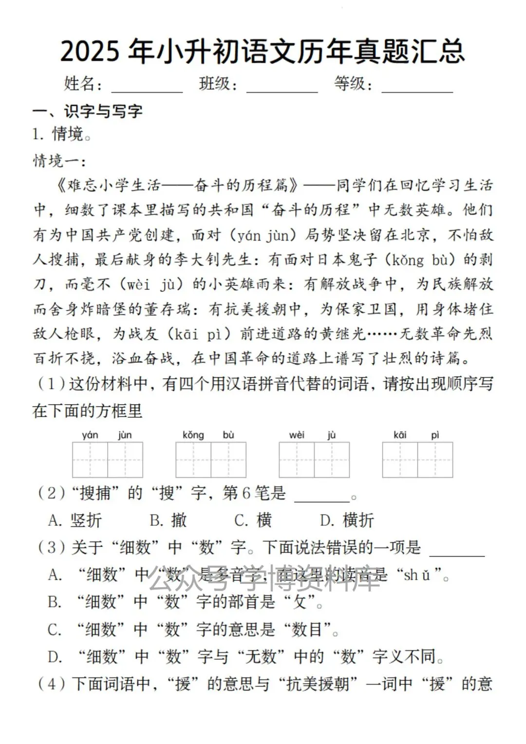 小升初语文历年真题基础板块汇总,电子版可打印!需要的家长抓紧打印给孩子练一练,读一读。