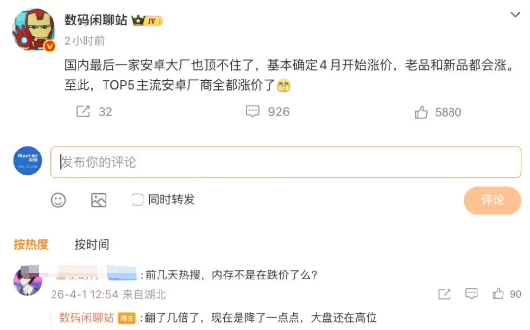消息一出,评论区网友纷纷提出疑问,有用户表示此前看到内存跌价的热搜,不解为何还会涨价。对此博主直接回应,内存价格此前已经翻了几倍,如今只是小幅回落,整体大盘仍处于高位,核心元器件的成本压力依旧巨大。还有用户询问老品涨价的具体幅度,博主也给出明确答案,参考此前OPPO、vivo、iQOO、一加、荣耀的调价标准,已发布老机型普遍涨价500元,这一涨幅也将成为行业标配。
