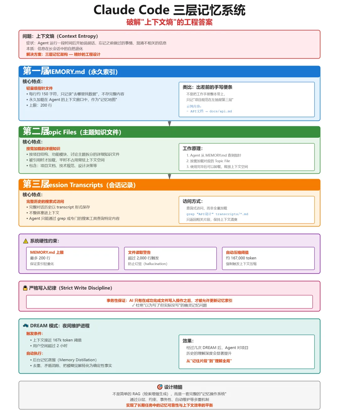 3层结构: MEMORY.md:轻量索引(每行 ~150 字符指针),永久加载在上下文,不存完整数据; Topic Files:按主题拆分的详细知识文件,按需加载;Session Transcripts:完整对话记录,仅通过 grep/搜索引用,不整段塞进上下文。这是解决长上下文退化的实战方案,远超简单 RAG。