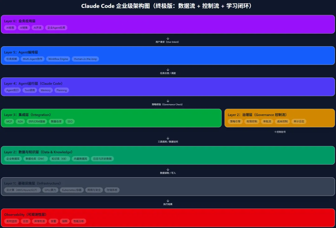 第三层缺失:企业级可观测性与成本控制。Claude Code有内部性能监控,但不对企业管理员开放。企业场景下,你必须能回答:这个月AI Agent帮工程师节省了多少工时?哪个业务流程的token消耗最高?哪次Agent执行偏离了预期路径?没有独立的可观测性栈,这些问题都是黑盒。