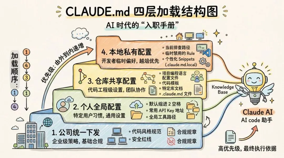 它有四层加载:团队级、个人全局级、仓库级、本地私有级。