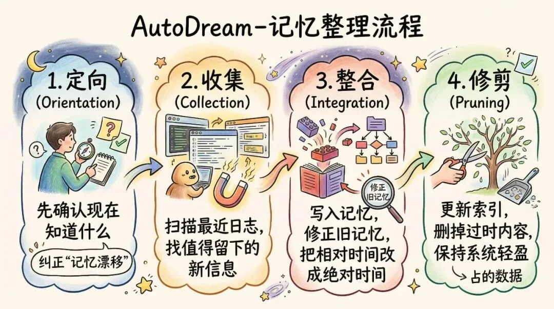 隔一段时间,它会回看最近的日志,把新的信息整合进去,把相对时间改成绝对时间,把已经漂移的旧记忆修正掉,再顺手修剪索引,防止整个系统越来越臃肿。