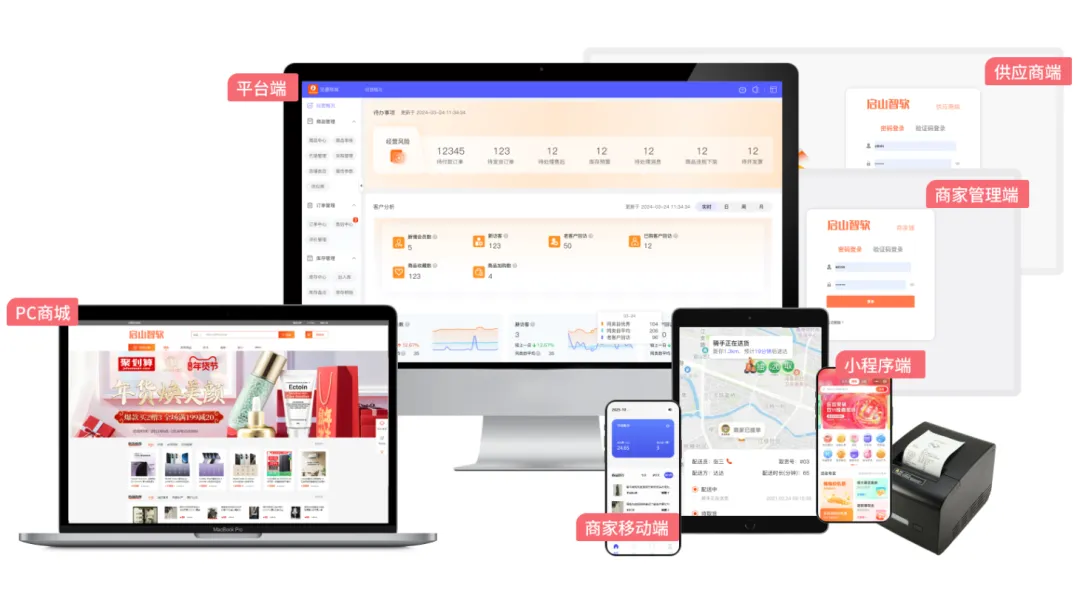启山智软研发的多用户商城系统源码,支持多个商家在同一平台经营,商品管理、订单处理、支付集成、物流跟踪、会员管理、营销推广等功能